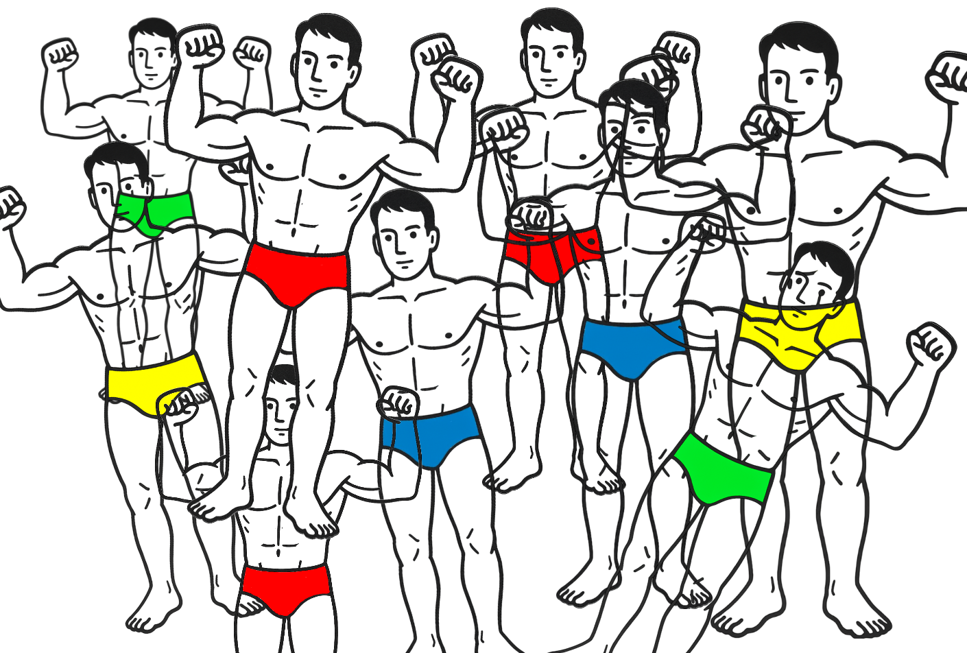 Accumulation de beaux nageurs en maillots de différentes couleurs. Impression numérique sur papier qualité musée au format 21 x 29,7 cm. Daté et signé au dos